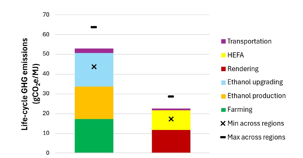 This publication examines how future changes in electricity and hydrogen carbon intensity influence the life cycle greenhouse gas emissions of sustainable aviation fuels. Using a prospective life cycle assessment approach, it assesses two mature SAF pathways—HEFA from waste fats and alcohol to jet from corn ethanol—showing how evolving energy systems and additional mitigation measures can deliver greater emissions reductions towards 2050.