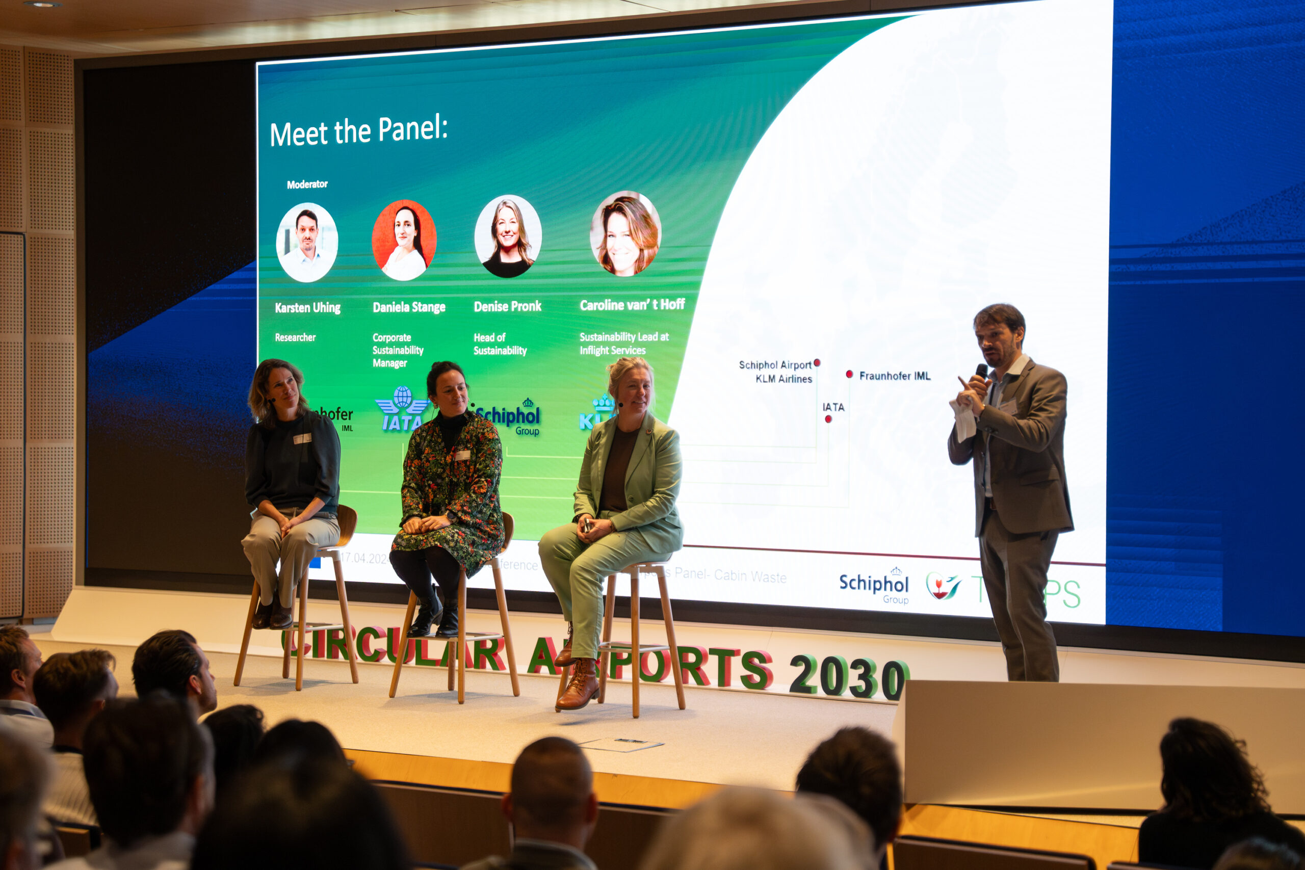 Circularity is in full development. Many initiatives were discussed during the conference. IATA has succeeded in influencing regulations, so not all cabin waste from outside the EU needs to be incinerated. Additionally, circularity is now linked to CO2 emissions. The potential of innovation was also touched upon. KLM uses data to more accurately estimate which meals and drinks passengers want, resulting in less waste on board. Schiphol talked about the successful collaboration with Transavia, Easyjet, Corendon, and TUI for separating cabin waste. The panel discussion was moderated by TULIPS partner Fraunhofer IML.